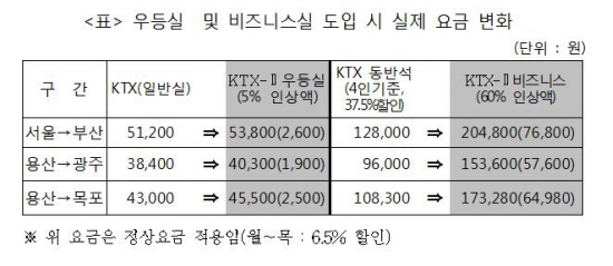 이는 현재 KTX 일반실의 절반인 역방향에 대해서는 순방향보다 5% 할인되고 있는 점을 감안하면 체감요금 인상율은 5% 보다 훨씬 높은 수준.