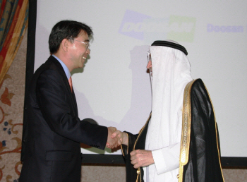 | <사진설명=두산중공업 윤석원 전무(왼쪽)가 사우디아라비아 수전력청 관계자로부터 이노베이션 어워드를 수상했다.> | ||