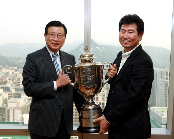| <박삼구 한국프로골프협회 회장(사진 왼쪽)이 13일 오전, 양용은 선수(사진 오른쪽)와 함께 US PGA 챔피언 트로피를 들고 기념촬영하고 있다.> |