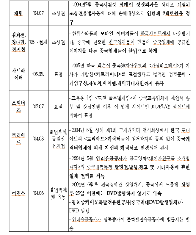 국회 문화체육관광방송통신위원회 안형환(한나라당, 서울․금천)의원이 한국콘텐츠진흥원으로부터 제출받은 “해외 국산캐릭터 지적재산권 침해현황” 국정감사 자료를 분석한 결과, 중국의 한류 콘텐츠 침해 사례로는 ‘대장금’, ‘보디가드’, ‘불새’ 등의 우리나라 드라마의 해적판 DVD를 출시하거나 김희선, 장나라, 전지현 등 우리나라 연예인의 초상권 침해, 게임 카트라이더, 스피너즈 불법 표절 등이 있는 것으로 조사됐다.
