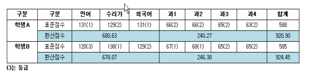 표준점수 단순 합산을 통해 보면 학생A가 3점 정도 높다. 평균 등급을 통해서도 학생A는 1.5등급, 학생B는 1.87등급으로 학생A가 높은 것을 알 수 있다. 단순합산이나 등급을 통해 보면 학생A가 학생B보다 지원이 유리해 보이지만, 실제 대학의 환산점수를 통해 보면 점수가 역전되는 현상이 발생한다.