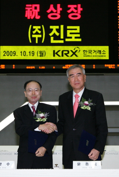 | 상장증서 서명후 기념촬영 왼쪽부터 이광수 한국거래소 유가증권시장본부장, 윤종웅 ㈜진로 대표이사 | ||