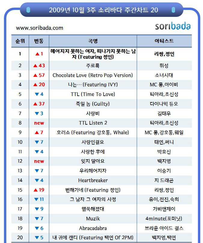 또한 휘성과 소녀시대의 약진도 두드러진다. 휘성의 ‘주르륵’은 전주 대비 43계단을 뛰어올라 2위에 랭크되었으며, 최근 에프엑스와 함께 한 소녀시대의 '초콜릿 러브'가 빠른 상승세를 보이며 3위로 진입, 팽팽한 상위접전을 펼치고 있다.