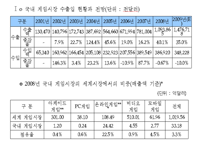 우리 게임의 해외수출도 ‘08년 10억9386만 달러를 기록해 ’07년 7억8100만 달러에 비해 40.1%가 증가했으며 ‘04년 성장률 124.4%를 보이기도 하는 등 게임의 해외수출시장은 그 증가폭이 매우 큰 것으로 조사됐다.