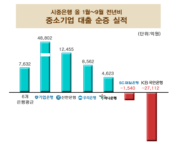 특히 기업은행은 중소기업에 대한 대출을 지난해에 비해 무려 4조8802억원이나 늘린 것과 비교하면 국민은행은 정부의 중소기업 대출 강화정책에 거꾸로 가고 있다는 비난을 받아 마땅한 셈이다.