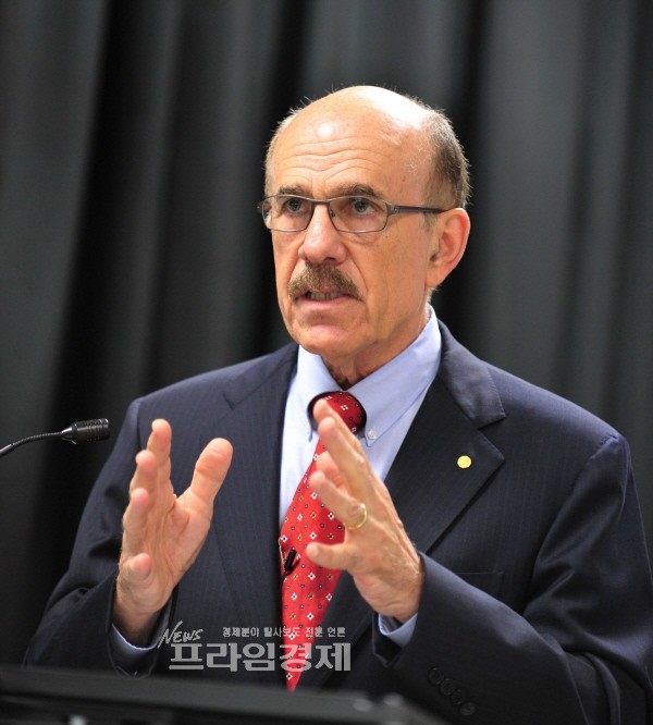 [프라임경제]비아그라 개발의 단초가 된 심혈관계 물질인 산화질소(NO)를 발견, 지난 1998년 노벨 생리의학상을 수상한 루이스 이그나로 건국대 석학교수가 22일 오후 건국대 의학전문대학원에서 ‘기초의과학 연구의 중요성’을 주제로 특강을 하고 있다. (사진=건국대 제공)