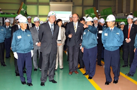 | <사진설명= 게오르기 파르바노프 불가리아 대통령 일행이 현대중공업 민계식 부회장, 최길선 사장의 영접을 받으며 변압기공장을 시찰하고 있다> | ||