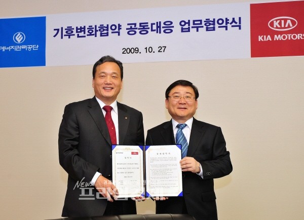 | <에너지관리공단 이태용 이사장(왼쪽)과 기아자동차 이형근 사장이 서울 양재동 기아자동차 본사에서 기후변화협약 공동 대응을 위한 업무협약을 체결했다.> | ||