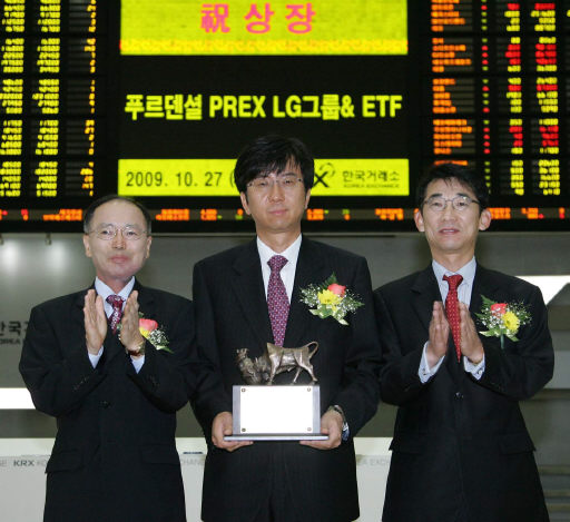 [프라임경제] 한국거래소는 27일 여의도 서울사옥 종합홍보관에서 LG그룹 소속 상장기업 등 19개 종목으로 구성된 테마 상장지수펀드(ETF)인 '푸르덴셜 PREX LG그룹 & ETF'의 유가증권시장 신규상장기념식을 개최했다고 밝혔다.