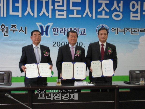 | <이정무 한라대학교 총장, 김기열 원주시장, 이태용 에너지관리공단 이사장이 친환경 에너지자립형 시범마을 조성을 위한 업무협약을 체결하고 있다.> | ||