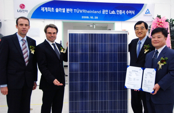 | <LG전자가 전 세계 태양전지 인증시장의 70%를 점유하고 있는 독일의 "티유브이 라인란드" 로 부터 세계최초로 태양전지 공인시험소로 지정됐다. 사진은 10월 28일 서울 서초구 LG전자 우면R&D캠퍼스에서 티유브이 라인란드로 부터 공인시험소 인증서를 수여받고 있다.> |