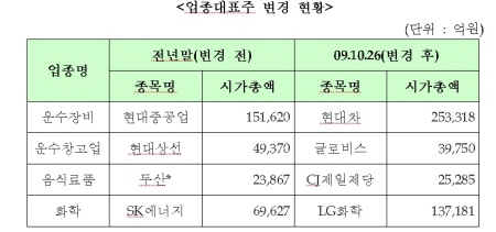 한편, 대표주 신규진입으로는 △현대차(운수장비) △글로비스(운수창고업) △CJ제일제당(음식료품) △LG화학(화학)이며, △현대모비스(운수장비) △현대상선(운수창고업) △롯데쇼핑(유통업) △진로(음식료품) △삼성이미징(의료정밀) △녹십자(의약품) △한국제지(종이목재) △SK에너지(화학)가 업종2위주로 진입했다.