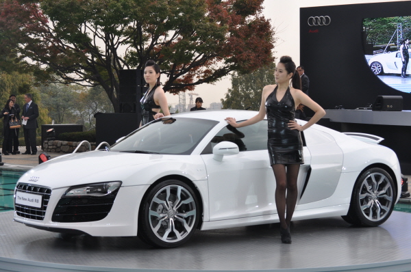 [프라임경제] 아우디 코리아 주최로 29일 남산 하얏트 호텔에서 열린 신차발효회 현장에서 모델들과 함께 '뉴아우디 R8' 이 멋진 자태를 드러내고 있다.