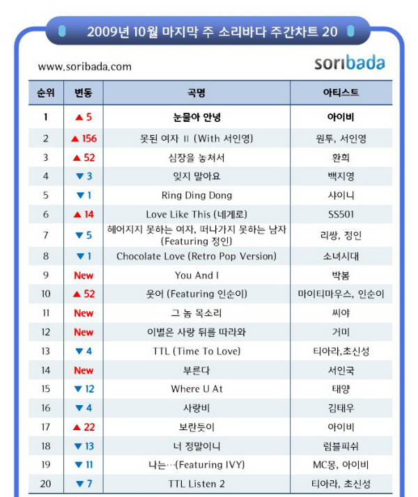 특히 10월 마지막 주 가요계는 신곡들의 강세가 두드러지며 치열한 순위 다툼을 벌였다. 씨야의 ‘그 놈 목소리’가 11위, 거미의 ‘이별은 사랑 뒤를 따라와’가 12위, 서인국의 ‘부른다’가 14위에 랭크되는 등 새롭게 발표된 곡들이 수직상승하는 양상을 보이며 중상위권에 속속 진입했다.
