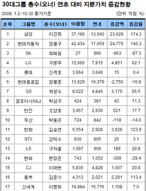 반면, 최근 주식시장이 회복세를 보였음에도 불구하고 30대그룹 총수 가운데 올해 초에 비해 보유주식 지분가치가 하락한 총수는 6명밖에 없었던 것으로 확인됐다.