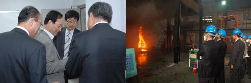 | < 사진 = 동부화재 김순환 사장(왼쪽사진 두번째), 손해보험CEO들의 화재시험 참관(오른쪽사진) | ||