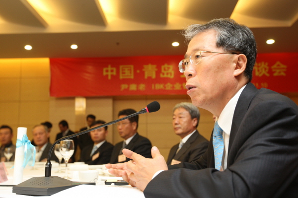 <사진=윤용로 기업은행장(오른쪽)이 10일 중국 칭다오 하이칭 호텔에서 현지 진출 기업인 30여명에게 금융지원방안을 설명하고 있다.>