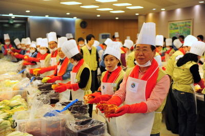 포스코는 10일 봉사활동의 시너지를 높이기 위해 전체 그룹차원의 포스코 패밀리 봉사단을 창단하고, 이를 기념해 포스코센터 직원 대식당에서 연말 소외계층을 위한 김장담그기 봉사활동을 펼쳤다.