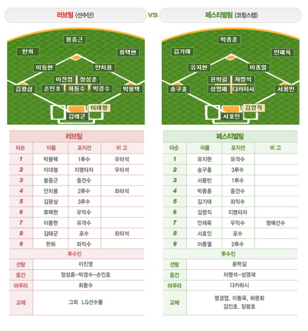 코칭스태프로 구성된 ‘페스티벌팀’은 유지현-송구홍 코치가 1-2번 테이블 세터로, 서용빈 코치-박종훈 감독-김기태 2군 감독이 클린업트리오로 나서며 LG트윈스 명예선수인 한류스타 안재욱씨가 7번타자 우익수로 참가한다. 또한 통산 100 완투에 빛나는 윤학길 코치가 선발 마운드에 오르며 차명석-성영재 코치에 이어 다카하시 코치가 마무리 투수로 나선다.