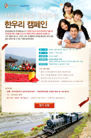 [프라임경제] 한국관광공사(사장 이참)와 한국철도공사(사장 허준영)은 2009년 12월3일 서울역을 출발, 전라남도 곡성역 인근의 기차마을을 체험하는 다문화가정 대상 국내여행 행사인 '한우리 캠페인‘ 을 실시한다.