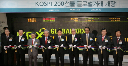 [프라임경제]16일 한국거래소(KRX)는 부산 본사 종합홍보관에서 'CME연계 코스피200선물 글로벌 거래 개장식'을 개최했다.