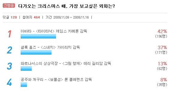 ‘다가오는 크리스마스 때, 가장 보고싶은 외화’를 묻는 설문을 통해 크리스마스를 맞아 나들이에 나설 연인과 친구, 가족 관객들을 사로잡을 최고의 영화를 뽑은 것. 이번 설문에서 인기 원작과 화려한 캐스팅, 흥행작의 속편 등 다양한 매력을 지닌 작품들의 접전 끝에 1위를 차지한 작품은 바로 제임스 카메론 감독이 12년만에 선보이는 액션 어드벤처 <아바타>.
