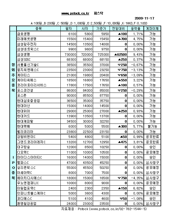 IPO관련 종목에서는 공모예정(11월19~20일)종목인 이원컴포텍 2350원(+6.82%)으로 상승폭이 가장컸다. 11월19일 상장예정인 그랜드코리아레저(+3.81%)는 1만2950원으로 공모가 대비 약+8% 수준에서 기준가를