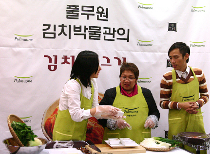 [프라임경제]풀무원김치박물관을 방문한 라농그룻 수운츠위(Sub Lt. Ranongruk Suwunschwee) 태국 정보통신부 장관과 그 일행이 김치담그기 체험을 하고 있다.