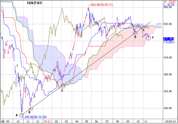 타이쿤은 “2009년 10월 28일 대음봉은 그동안 유효하게 작용해온 상승 추세선을 붕괴시킨 것”이라며 “상승 추세선이 붕괴된 후 약한 되돌림이 있었는데 중요한 지지선을 순차적으로 붕괴시키는 것이 그 이후의 흐름”이라고 말했다.