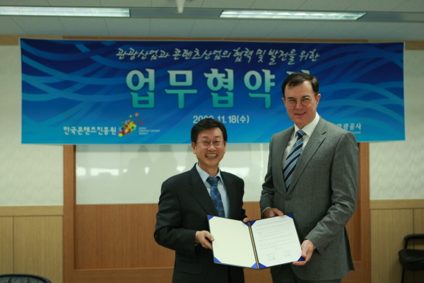 한국콘텐츠진흥원(원장 이재웅)과 한국관광공사(사장 이 참)는 18일 오전 상암동 문화콘텐츠센터 본사에서 ‘관광산업과 콘텐츠산업의 협력 및 발전을 위한 업무협약’을 체결했다.