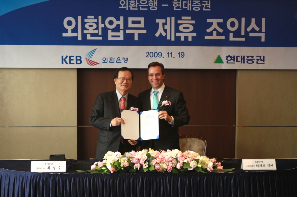 [프라임경제] 현대증권(대표이사 최경수)은 외환은행(은행장 래리 클레인)과 19일 서울 롯데호텔에서 실시간 환전 서비스에 대한 “외환업무 제휴 조인식”을 가졌다고 밝혔다.