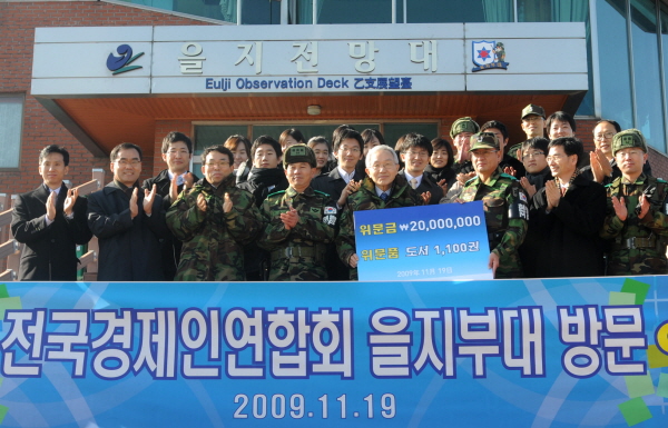 [프라임경제] 전경련은 19일 정병철 상근부회장, 이승철 전무 등 전경련 임직원들이 참석한 가운데 강원도 인제군에 위치한 을지부대(자매부대)를 방문, 을지전망대(1988년 전경련 후원으로 건축)에서 위문품과 위문금을 전달했다.