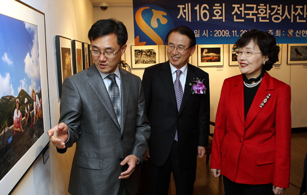 <사진=제 16회 신한은행 전국환경사진 공모전에서 금상을 수상한 정철원(왼쪽) 씨가 이백순 신한은행장(가운데)과 김명자 그린코리아21포럼 이사장에게 사진 설명을 하고 있다.> |