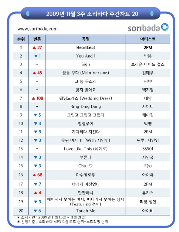 반면 여성 대표 주자인 브라운아이드걸스의 ‘Sign’와 씨야의 ‘그놈 목소리’는 각각 3위와 5위로 지난 주 순위를 유지하는데 그쳤으며, ‘마쉬멜로우’로 복귀한 아이유가 전주 대비 68계단 올라선 16위를 기록하며 남성 가수들 사이에서 선전하고 있다.