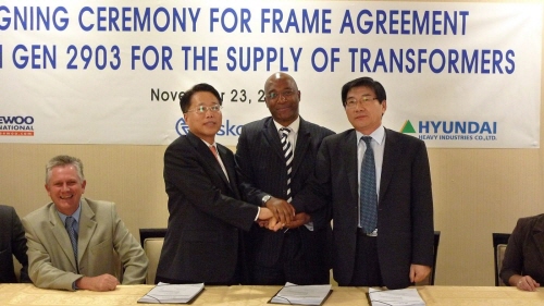 | <사진설명 = 남아공에서 열린 초고압 변압기 계약식. 왼쪽부터 현대중공업 신영순 상무, 남아공 전력청 구매총괄이사, 박정환 대우인터내셔널 전무.>