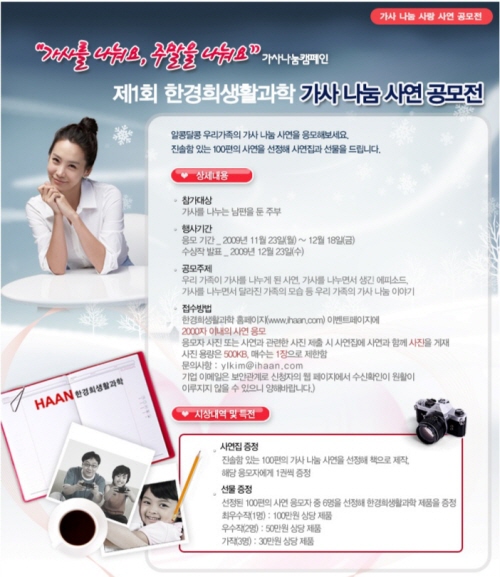 사연은 오늘부터 4주간 한경희생활과학 홈페이지(www.ihaan.com)에서 응모 받고 가족이 가사를 나누는 기혼 여성이라면 누구나 참여 가능하다. 응모는 이벤트 페이지에 2000자 이내로 사연과 사진을 올리면 된다.