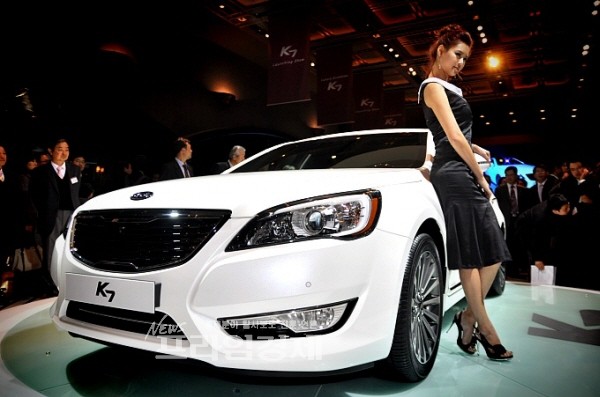 [프라임경제] 기아차는 24일, 서울 하얏트호텔에서 K7의 신차발표회를 갖고 준대형 세단의 역사를 새롭게 쓸 걸작인 최첨단 하이테크 럭셔리 세단 K7의 웅장한 모습을 공개했다. 레이싱걸이 화려한 자태를 드러낸 K7과 함께 포즈를 취하고 있다.