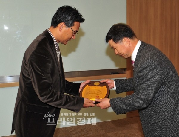 24일 건국대 더 클래식500에서 열린 '정진화 장학금' 보은회에서 류영수 건국대 학생복지처장이 군 전역을 앞두고 훈련 중 순직한 아들의 이름으로 장학금을 6년째 건국대에 기부하고 있는 정태영 씨에게 감사패를 전달하고 있다.