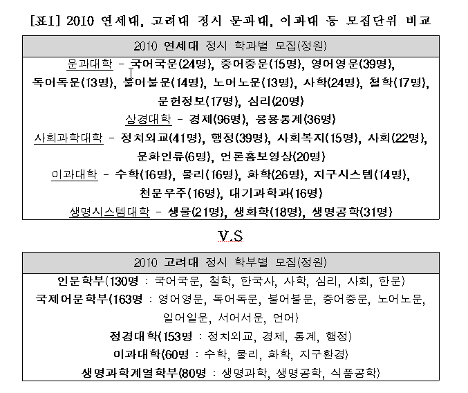 모집단위로 보면, 연세대 문과대학 196명을 국문(24명), 중문(15명), 영문(39명), 사학(24명), 철학(17명), 심리(20명) 등으로 세분화하여 10개 학과별로 모집하는 데 반하여 고려대는 문과대학을 인문학부 130명, 국제어문학부 163명 학부별로 모집한다.