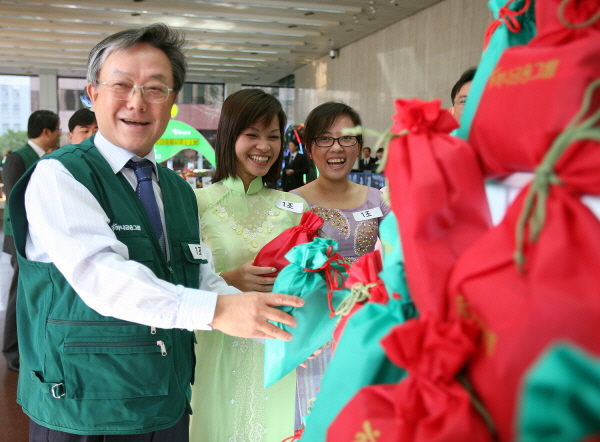 <사진=하나금융그룹 김종열 사장이 결혼이주민 여성들과 함께 소외계층을 돕기 위해 나눔 보따리를 만들고 있다.> |