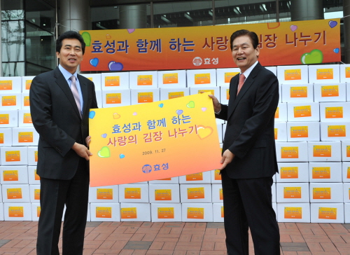 [프라임경제] 효성그룹은 27일 오후 서울 마포구청에서 이상운 효성 부회장과 신영섭 마포구청장이 참석한 가운데 사랑의 김장김치 전달식을 갖고, 마포관내의 저소득층 1500세대에 김치를 전달했다.