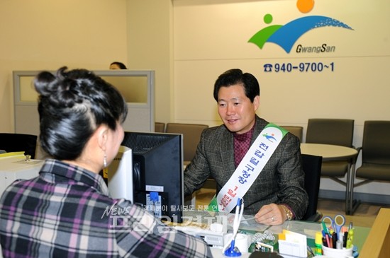 | 전갑길 광산구청장이 언제라도 민원센터 개소 2주년을 맞아 1일현장근무에 나서 시민들에게 민원서류를 발급해주고 있다. | ||