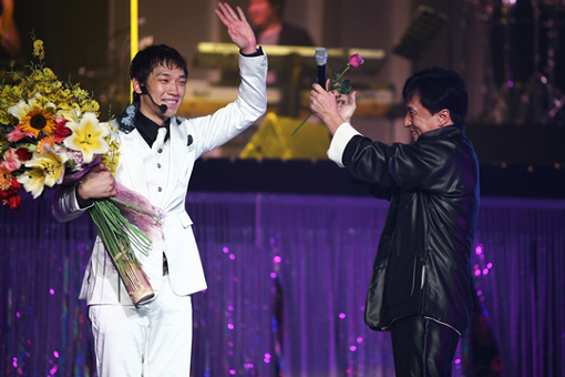 꽃다발을 들고 등장한 성룡은 감격에 벅차하는 비에게 특유의 큰 미소로 화답하며 먼저 중국어로 홍콩 팬들에게 안부 인사를 전했다. 그리고 곧 "비행기 시간에 늦어 가 봐야 하지만 비에게 진한 포옹과 깊은 키스를 하고 싶다"라는 말과 함께 비를 꼬옥 껴안았다.