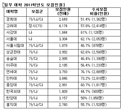 2010학년도에 전체 모집정원의 57.9%를 모집하던 수시모집 인원은 2011학년도에는 60.9%인 231,035명을 선발하게 된다. 물론 올해와 동일하게 수시 미충원 인원 등이 정시로 이월되어 실제 모집인원은 다소 줄어들 수 있으나, 수험생들에게는 이제 수시가 선택이 아닌 필수 모집시기가 되었음을 숙지하도록 하자.