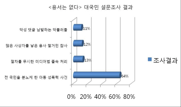 지난 11월16일부터 29일까지 2주간, 온라인 사이트 ‘네이트’, ‘곰TV’, ‘잡코리아’, ‘GS이숍’, ‘마이클럽’, ‘무비스트’ 및 <용서는 없다> 홈페이지(www.nomercy2010.co.kr)에서 진행한 이번 대국민 설문에는 네티즌 2만5000명이 참여해 뜨거운 반응을 불러일으켰다.