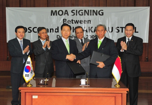 포스코 정준양 회장은 2일 자카르타시 인도네시아 정부청사에서 인도네시아 국영철강사인 크라카타우스틸 파즈와르 부장 사장과 연산 600만톤 규모의 일관제철소 합작건설에 관한 합의각서(MOA)를 체결했다.