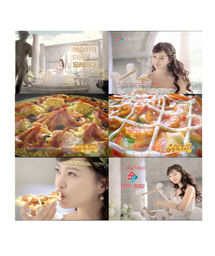 여신의 포스가 가장 잘 느껴지기로 유명한 한예슬은 ‘쉬림푸스’피자로 그녀만의 매력을 또 한번 마음껏 발산하였다. 그녀는 천상에서 막 내려온 듯한 신비로운 분위기의 하얀 드레스를 입고 리라를 연주하며 ‘쉬림푸스’피자를 선보인다. 한예슬이 입은 ‘쉬림푸스 드레스’는 올림푸스 신전의 여신을 표현하기 위해 특별히 제작되었고, 메인 토핑인 쉬림프의 특성을 살리기 위해 어깨에는 황금색 새우브로치를, 지중해의 이미지를 강조해주기 위해 머리에는 블랙올리브 헤어밴드를 둘렀다. 또한 겨자씨가 들어간 화이트무스를 표현하는 드레스 자락에는 노란색 꽃으로 환상적인 분위기를 더해 맛의 여신 한예슬의 이미지와 천상의 요리 ‘쉬림푸스’피자를 연출했다.