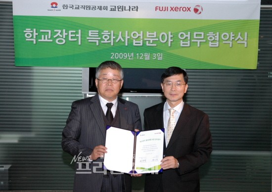 문서관리 컨설팅 기업 한국후지제록스(대표 정광은)와 한국교직원공제회 산하 기업 교원나라(대표 성창제)는 교육기관 맞춤형 전자계약 지원시스템 ‘학교장터’의 활성화를 위한 업무협약을 3일 체결했다.