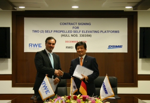 | <사진설명 = 지난 3일 대우조선해양 남상태 사장(오른쪽)과 RWEI의 티에리 앨렌즈 사업본부장(왼쪽)이 해상풍력발전설치선 건조에 대한 계약서에 서명한 후 악수를 하고 있다.> | ||