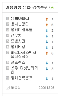 '터미네이터', '에이리언 2', '타이타닉' 등을 탄생시키며 전세계 관객들을 매료시킨 제임스 카메론 감독의 신작 '아바타'가 네이버 개봉예정 영화 검색순위 1위에 올라 그 저력을 입증했다. '아바타'는 제임스 카메론 특유의 탄탄한 스토리텔링은 물론 기존 영화들에 쓰였던 CG 기술인 모션 캡쳐 방식을 세네 단계 업그레이드 시킨 이모션 캡쳐 방식을 도입, 지금껏 본적 없는 영상 혁명을 경험케 할 것으로 기대를 모으고 있다.
